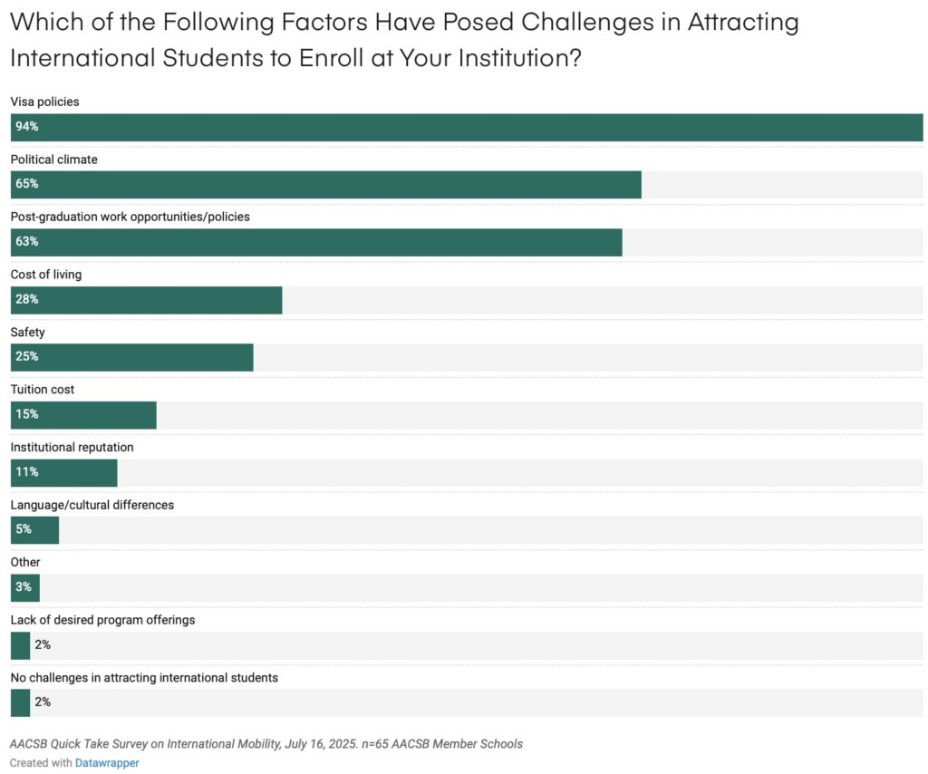 Among schools located in countries where policy has shifted, 94% cite new and more restrictive visa rules as the primary challenge in attracting international students. Other factors included the political environment in their country and concerns over post-graduation career opportunities.