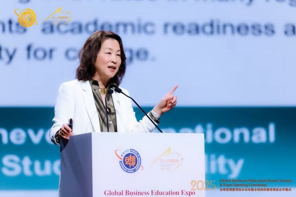 Lily Bi, president and CEO of AACSB International, delivers a keynote address at Fudan University in Shanghai, China.