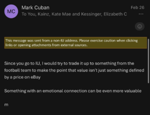 Young reached out to the associate dean of the Media School, who posted about the project on Twitter. She also emailed the infamous former IU grad Mark Cuban who gave her his advice. She kept IU football coach Curt Cignetti updated on her trades, even though he didn’t wish to trade any of the items. He did however, want to give her and her group something.